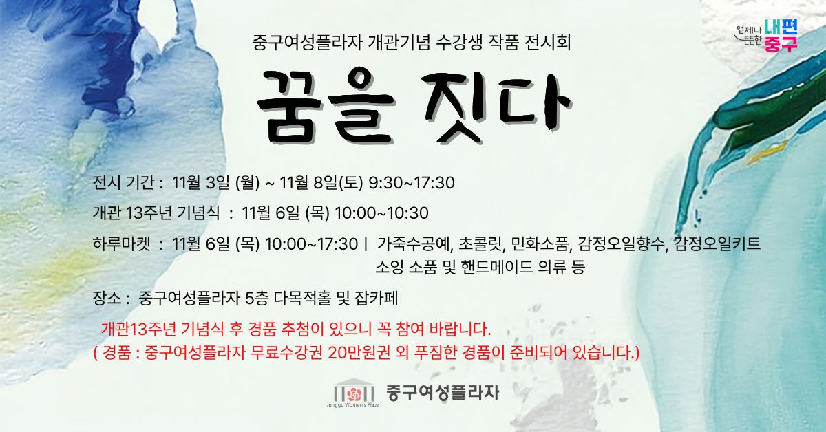 * 중구여성플라자 개관 13주년 기념식 및 경품 행사가 있으니 많은 참여 바랍니다.