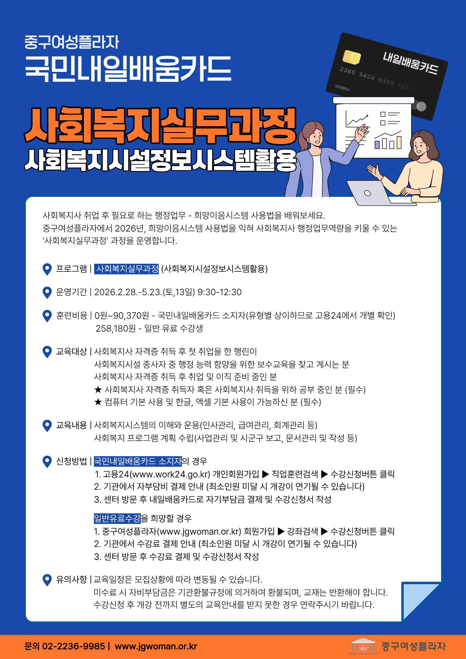○ 신청: 내일배움카드 결제 희망 시 고용24 로그인 후 훈련기관에서 중구여성플라자 검색, 수강신청
