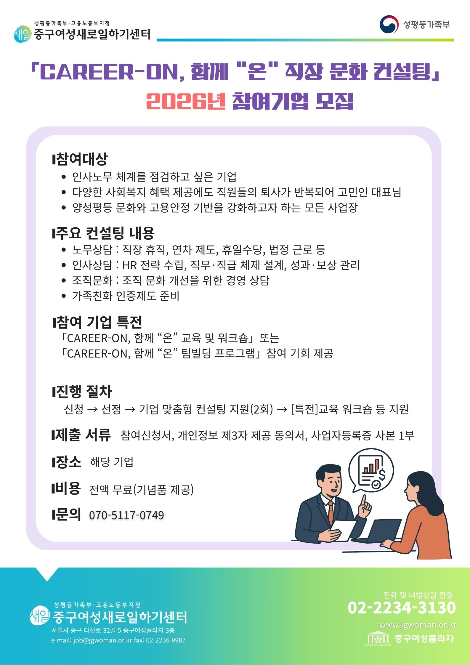 2026년 경력단절예방지원사업 「CAREER-ON, 직장문화 컨설팅」(중점사업) 참여업체 모집
